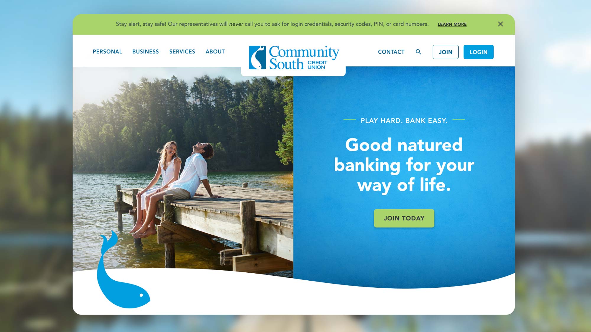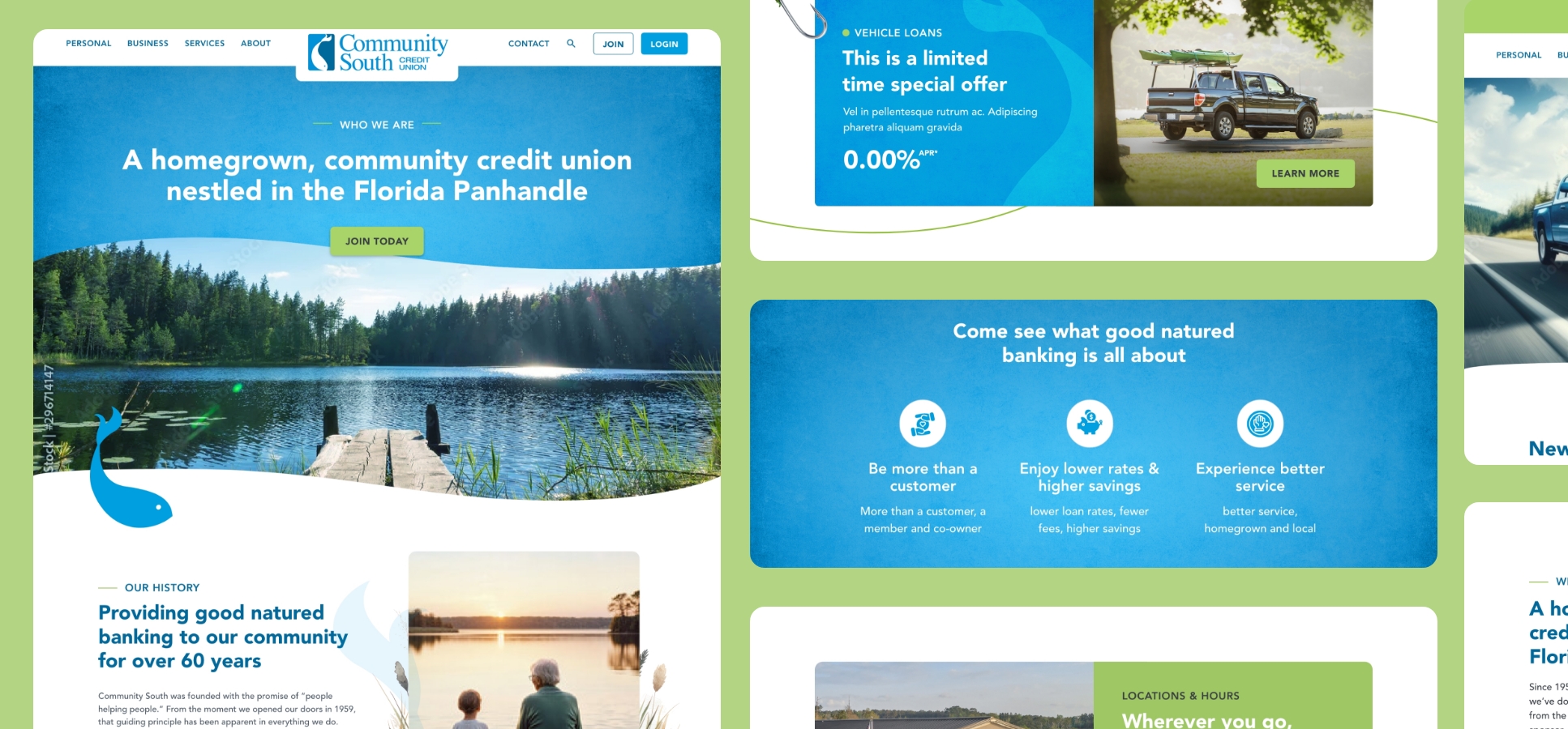 Community South’s website cuts through the noise, delivering decisive financial solutions without unnecessary frills. We were challenged with balancing functionality specifically designed for a rural community with limited access to reliable internet and a playful aesthetic. The website ensures every member— from new or growing families opening a youth account to small business owners looking to expand —can find the services they need.